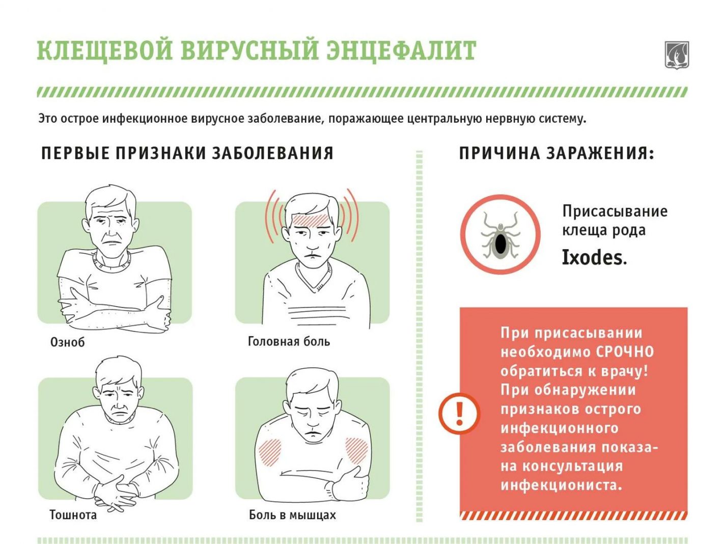 Кене арқылы жұғатын инфекциялар (мысалы, Клещевой энцефалит, Болезнь Лайма) кене шағу арқылы беріледі. Белгілері: дене қызуы, әлсіздік, бас ауруы. Кенені дер кезінде алып тастап, қажет болса дәрігерге қаралу маңызды.